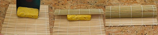 20. Remove from the pan and place the omelette on the bamboo mat and wrap it up. Shape the egg when it is still hot. Let it stand for 5 minutes.