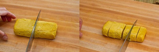 21. Slice the omelette into ½" (1 cm) pieces. Serve with grated daikon and soy sauce.