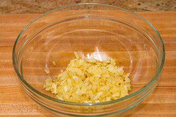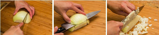 - Chop the onion finely. With the knife tip pointing toward the root, slice the onion to within ½ inch of the base. Make about ¼ inch parallel cuts. Then slice the onion horizontally about ¼ inch parallel cuts. Then cut perpendicular to the first slices you made. If the onions need to be chopped finer, you can run your knife through them in a rocking motion. Be sure to hold down the tip of the knife, otherwise the onions are going to go flying around the room.
