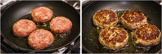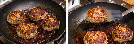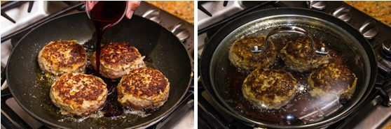 - After you flip, pour red wine and lower heat to medium low heat. Cover and cook for 5 minutes to thoroughly cook the inside of the patties (adjust cooking time depending on thickness).