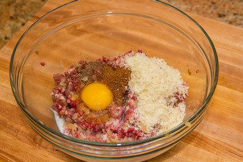 - Add an egg, milk, Panko, salt, black pepper, and nutmeg.