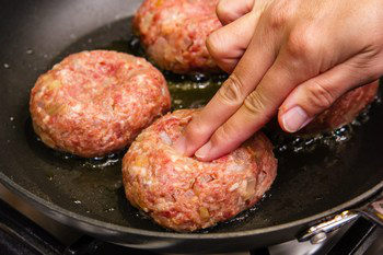- In a large pan, heat oil over medium heat and place the patties gently on the pan. Indent the center of each patty with 2 fingers because the center of patties will rise with heat.