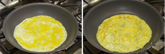 - For eggs, you make thin egg crepe and cut into thin strips (Kinshi Tamago). If you want to make super thin crepe, follow my recipe here (How To Make Shredded Egg Crepe). Whisk together the eggs, sugar and salt. Heat the oil in the pan over medium heat. Pour the egg mixture into the pan and cook on both sides.