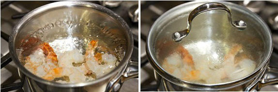 - For shrimps, bring a small pot of water to a boil. Add sake and shrimp and cover with the lid. The alcohol in the sake will help remove the smell and tender the meat. Turn off the heat when the color of shrimp started to change and let it cook with remaining heat. Do not overcook otherwise shrimp will become hard. Transfer shrimps to a plate and let them cool.