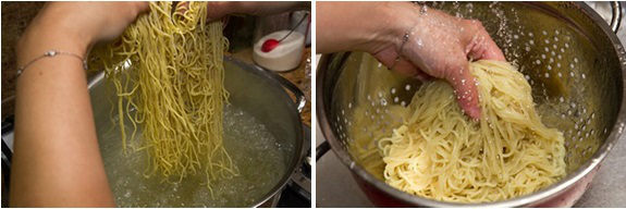 - For the noodles, bring a pot of water to a boil and add the noodles, separate the noodles before dropping into water. Cook according to package directions. Drain the water and rinse the noodles to remove starch. Soak the noodles into a bowl of ice water to cool. Drain completely and divide the noodles on plates/bowls.
