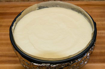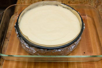 - Lightly grease the bottom and sides of a 9" (23 cm) spring-form pan with cooking spray and line with parchment paper. Wrap the base of the cake pan with aluminum foil (preferably with extra-large heavy duty foil) to prevent seepage. If you use regular size aluminum foil, make sure to seal the two sheets of foil very tightly by folding two edges and make one big foil.