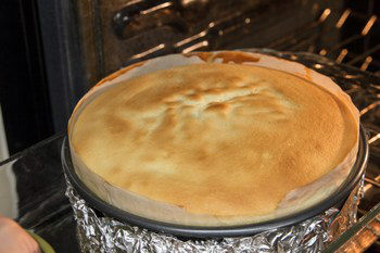 - Place the cake pan in a large roasting pan and pour 1" (2.5 cm) of boiling water in the roasting pan. Place the baking pan in the middle rack of the oven. (The reason why we put hot water in the pan is that steam will help making cake soft and moist and hot water around the cake will gradually cook inside the cake while baking in the oven.)