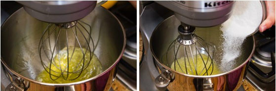 - To make meringue, beat the egg whites until stiff peaks form. In the bowl of electric mixer, whip the egg whites on medium low speed (speed 4) till opaque and foamy and bubbly. Then add ⅓ of the sugar at a time as the mixer runs. Once all of the sugar has been added, increase the mixer speed to high (speed 10) and whip for approximately 4 minutes, until the meringue has doubled in volume and is thick and glossy.
