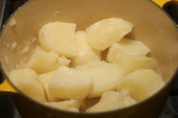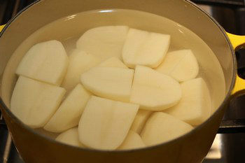 - In a large pot, put water and potatoes and bring it to a boil. Cook potatoes until a skewer goes through the potato easily.