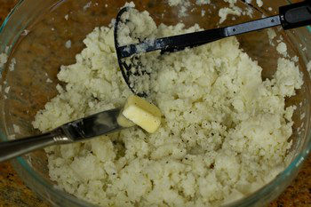 - Transfer the potatoes into a large bowl and mash the potatoes. Add salt, pepper, and butter.