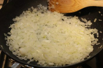 - In a large skillet, heat oil on medium high heat. Sauté onion until soft.