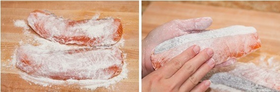 - Sprinkle ½ Tbsp. of all-purpose flour on one side of salmon and spread evenly. Flip over and sprinkle the rest of flour on the other side. Gently remove the excess flour.