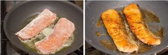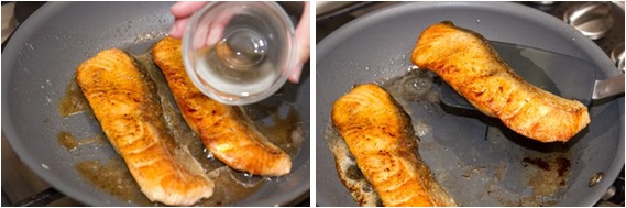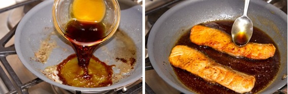 - Add the seasonings to the pan and increase the heat little bit. When the sauce starts to boil, add salmon back in the pan and spoon the sauce over the salmon.