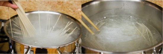 - For soba noodle, boil a lot of water in a large pot. Unlike pasta, you DO NOT add salt to the water. Add dried soba noodles in the boiling water in circulate motion, separating the noodles from each other. Boil soba noodles according to the package instructions (each one is slightly different). Mine says boil 4 minutes. Once in a while stir the noodles so they don’t stick to each other. Check the tenderness and do not overcook. I do not use "sashi mizu (adding water)" technique for this noodle as it's says so on the package.*
