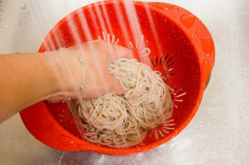 - Drain the noodles into a colander and wash the noodles in a cold running water to get rid of slimy texture. This is very important and key to great tasting noodle.