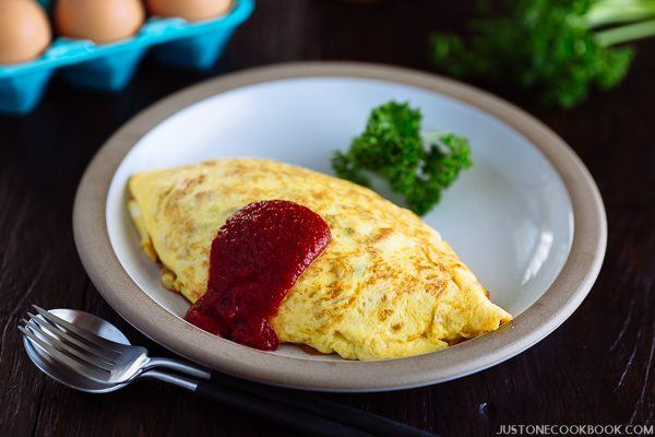 - When serving, garnish omurice with parsley and drizzle hot tomato sauce.