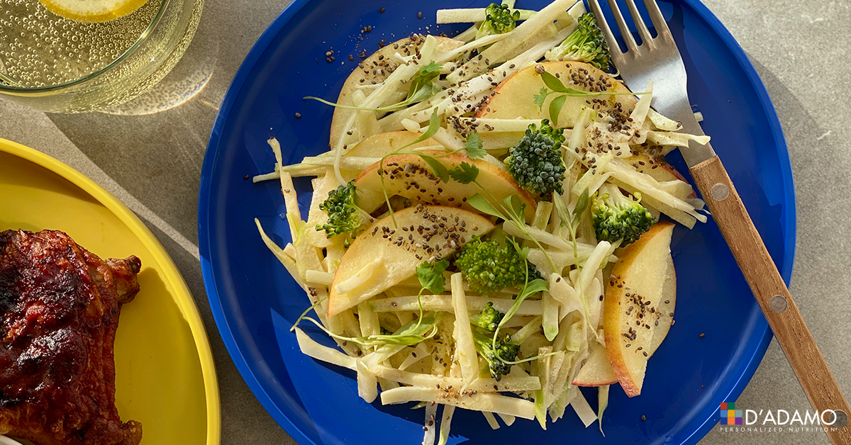 super-beneficial for you. We love this broccoli & apple slaw with a tangy mustard dressing. Pairs great with our BBQ recipes; BBQ Lamb recipe for Types B, AB and O, or our BBQ Chicken Thighs recipe for Types A and O. Find more nourishing recipes like this in Dr. Peter D’Adamo’s Eat Right 4 Your Type Personalized Cookbooks.