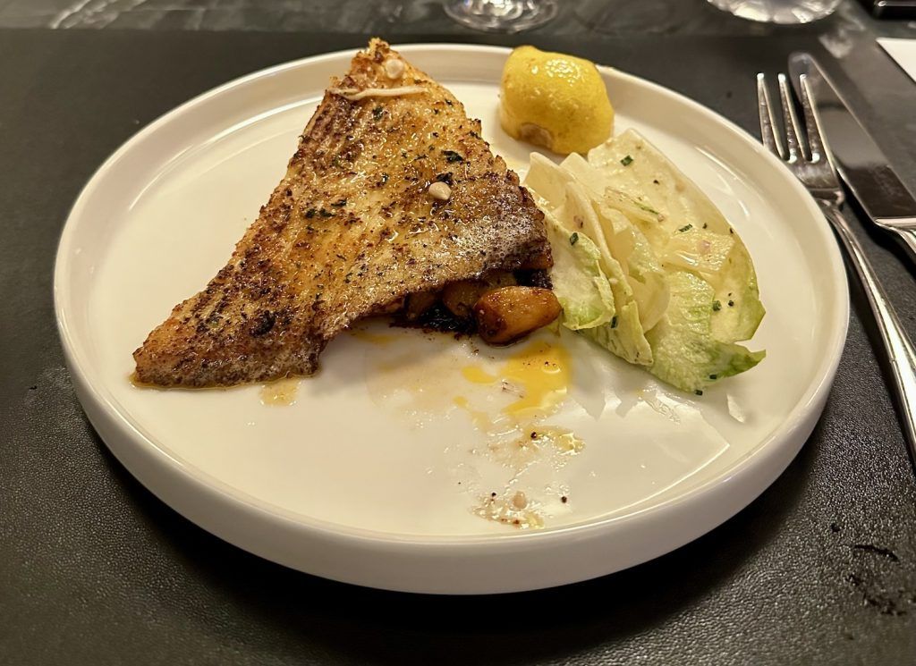 Блюдо: приготовленный теппан с крылышками скейта и салат из эндивов Comté (988 гонконгских долларов, часть кето-меню).