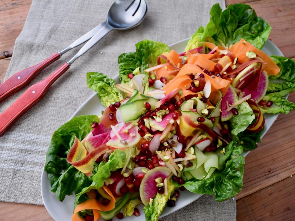 - При подаче щедро намажьте немного заправки дно длинной сервировочной тарелки. Сверху разложите дольки салата. Вокруг и поверх салата выложите яблоки, редис, ленты моркови и огурца. Украсьте фисташками и зернами граната. Подавайте с дополнительной заправкой.