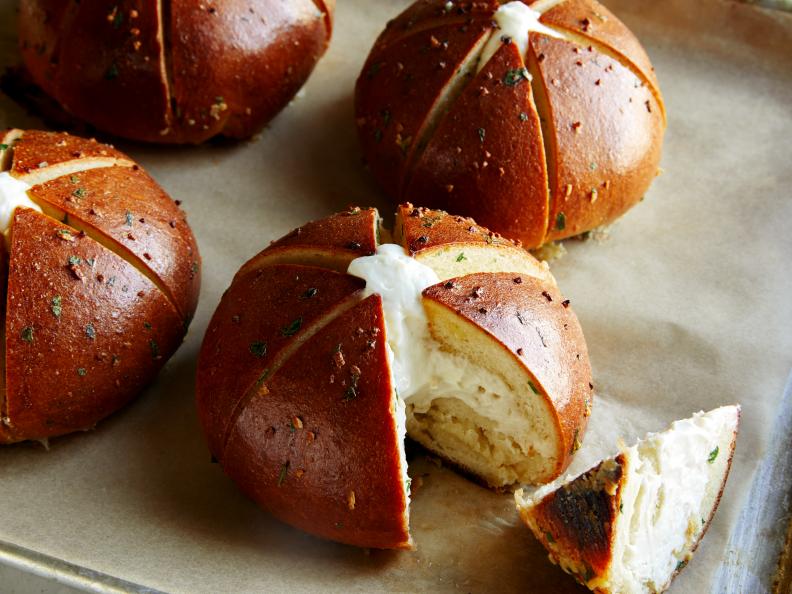 - Выпекайте до темно-золотистого цвета, блестящего и хрустящего снаружи, 13–15 минут (чеснок начнет пахнуть ароматно, а капли заварного крема начнут хрустеть/румяниться по краям). Дайте остыть в течение 10 минут, затем выдавите немного оставшейся начинки из сливочного сыра в центр каждого хлеба. (Хлеб слегка приоткроется, когда вы выдавите его в центр.) Подавайте немедленно.
