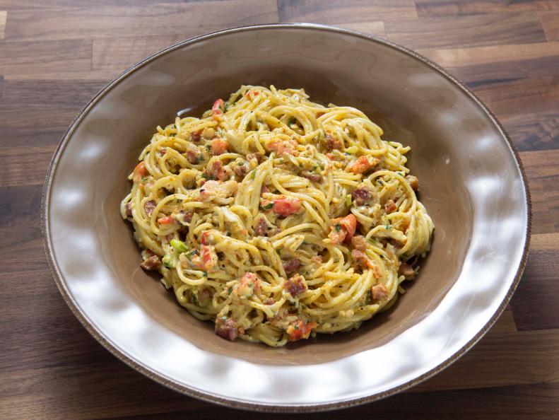 - Добавьте к яйцам 1 стакан кипятка с крахмалом, чтобы темперировать их. Слейте воду с макарон и добавьте к крабу. Перемешайте с яйцами и сыром и выключите огонь на 1 минуту. Отрегулируйте соль и перец, подавайте.
