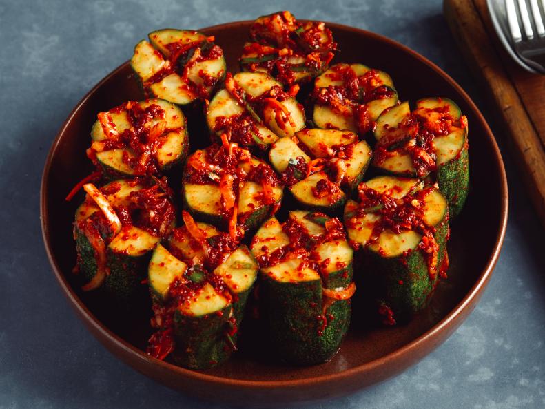 - Работая с одним огурцом за раз, одной рукой держите побеги открытыми, а другой рукой набивайте овощную смесь между побегами и намажьте ею все. (Равномерно распределите смесь между огурцами.) Подавайте немедленно или переложите в герметичный контейнер и оставьте при комнатной температуре на 4–6 часов, чтобы вкус лучше раскрылся. Я думаю, что кимчи вкуснее всего в холодном виде, поэтому перед подачей его рекомендуется поставить в холодильник минимум на час. Он будет храниться в холодильнике до 1 недели.