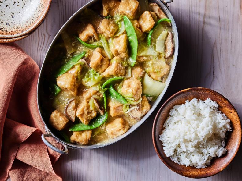 - Нагрейте масло в большой сковороде с высокими стенками или воке на среднем огне. Добавьте чеснок и имбирь и перемешивайте около 30 секунд. Добавьте смесь соуса, слойки тофу, капусту и нарезанные грибы. Увеличьте огонь и доведите до кипения, прижимая слойки тофу деревянной ложкой или лопаточкой, чтобы они размягчились и впитали соус.