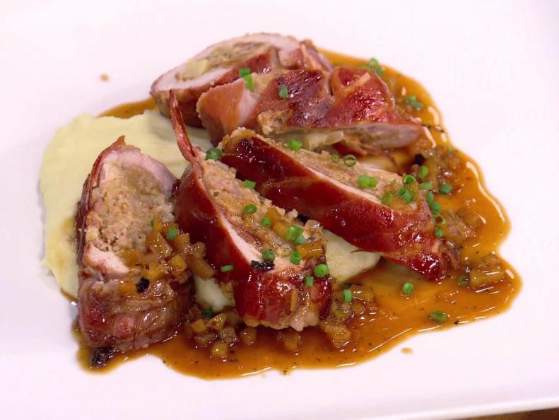 - Положите один из кусочков конопляного жира на большую плоскую рабочую поверхность. Выложите 3–4 ломтика прошутто посередине в один слой. Сверху выложите одну свиную отбивную. Выложите часть начинки на свинину и сверните рулетом, образуя аккуратный ровный рулет. Оберните конопляный жир ровным слоем вокруг свиного бревна, обязательно обернув его вокруг открытых концов, чтобы бревно получилось гладким и ровным. Для надежности перевяжите мясной шпагатом. Повторите то же самое с дополнительным соусом, прошутто, свининой и начинкой.