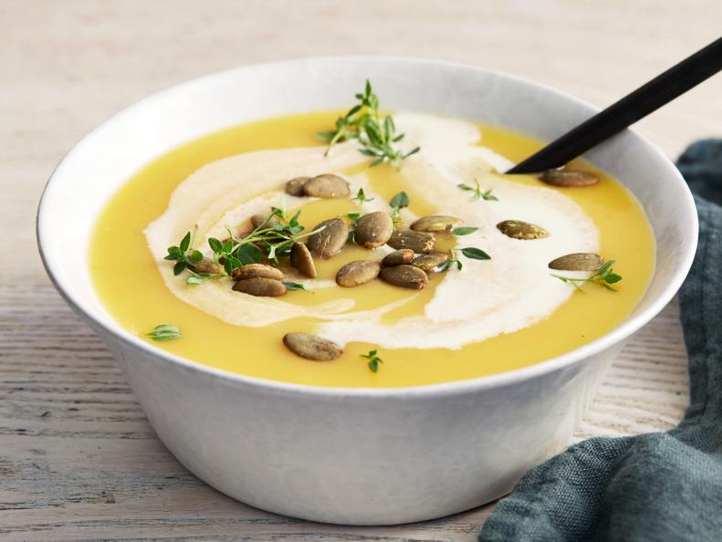 - Добавьте мускатную тыкву и варите, пока картофель и тыква не станут мягкими, около 20 минут, регулируя огонь по мере необходимости, чтобы поддерживать кипение. Снимите с огня, выбросьте тимьян и дайте остыть не менее 5 минут. Тщательно пюрируйте до получения однородной массы с помощью ручного погружного блендера или в 2–3 приема в блендере (не заполняйте блендер более чем наполовину).