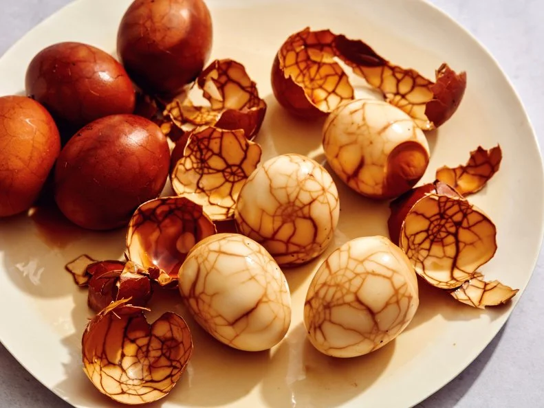 - Поместите треснувшие яйца в жидкость для тушения и варите на медленном огне под крышкой не менее 1 часа. Вы можете очистить и съесть яйца сейчас или, для максимального вкуса, выключите огонь и дайте кастрюле остыть до комнатной температуры. Поставьте ее в холодильник и дайте яйцам мариноваться 8 часов или ночь, убедившись, что жидкость покрывает яйца. Когда будете готовы подавать, осторожно разогрейте яйца в жидкости для тушения на среднем огне в течение примерно 10 минут. Процедите, оставив жидкость для тушения и яйца отдельно.