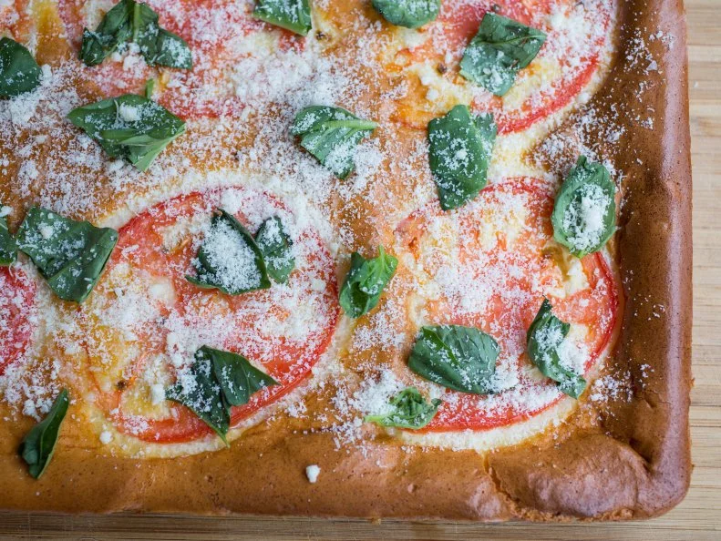 - Полностью охладите на решетке и оставьте на ночь в герметичном контейнере. Перед подачей сбрызните маслом и посыпьте хлопьями морской соли, листьями базилика и тертым пармезаном; нарежьте квадратиками.