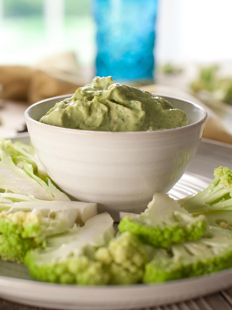 - Выложите нарезанную цветную капусту на сервировочное блюдо. В чашу кухонного комбайна или в блендер поместите сливочный сыр, кинзу, сок лайма, авокадо и чили и взбивайте до получения однородной кремообразной массы, около 1 минуты. Приправить солью и перцем. Переложите в небольшую миску и подавайте с цветной капустой для окунания.