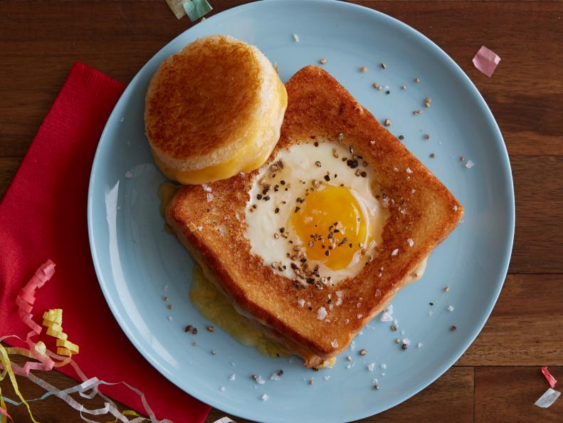 - Растопите сливочное масло в средней сковороде с антипригарным покрытием на средне-слабом огне и перемешайте, чтобы покрыть дно. Выложите внутреннюю и внешнюю части сэндвича на сковороду и готовьте до золотистого цвета снизу, 4–5 минут. Переверните каждый, вылейте яйцо в отверстие, посыпьте солью и перцем и готовьте, пока нижняя часть хлеба не станет золотисто-коричневой, яичные белки не затвердеют, а желток все еще будет жидким, 4–5 минут. В последнюю минуту приготовления накройте сковороду крышкой, чтобы яичный белок полностью приготовился. (Сэндвич может закончиться быстрее.) Переложите сэндвич с яйцом на сервировочную тарелку вместе с сэндвичем, чтобы окунуть его в яичный желток.