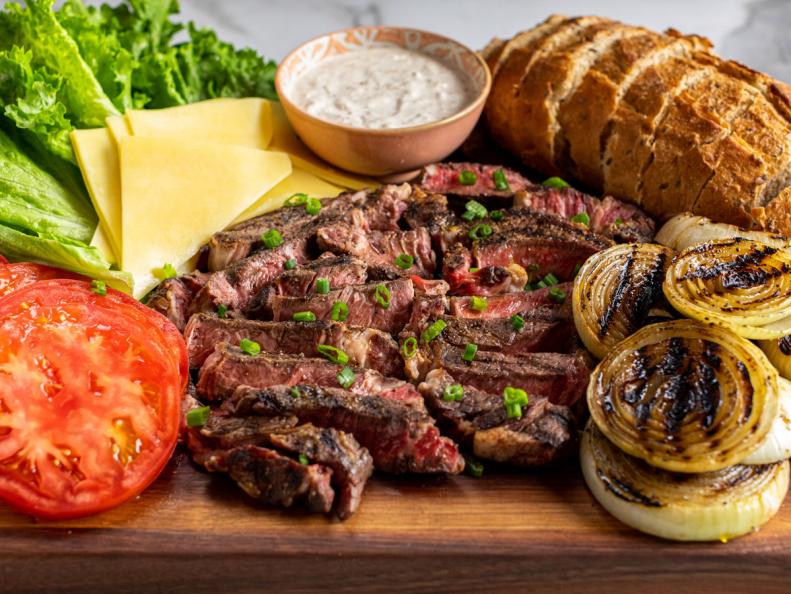 - Нарежьте стейк ломтиками и выложите его на середину разделочной доски или сервировочного блюда. Разломите лук и разложите его на одном углу доски. Нарежьте хлеб ломтиками и выложите его вдоль одной стороны доски. Используйте салат, помидоры и белый чеддер, чтобы заполнить отверстия. Посыпьте стейк зеленым луком и морской солью и сбрызните доску оливковым маслом. Поставьте миску с заправкой на доску.