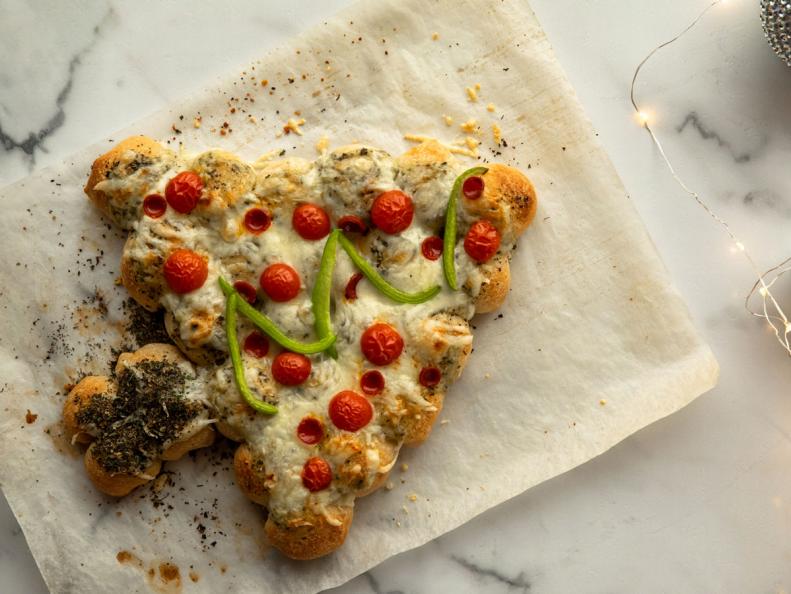 - Выньте противень из духовки и снова смажьте тесто второй половиной оливкового масла. Ложкой или лопаточкой распределите смесь соуса по дереву, оставив зазор в 1/2 дюйма по краю. Посыпьте моцареллой поверх соуса. Украсьте дерево, создав гирлянду из болгарского перца и украшения из помидоров и пепперони. Посыпьте ствол дерева оставшейся 1/2 чайной ложки итальянской приправы. Выпекайте, пока сыр не расплавится, а корочка не станет золотистой, еще 15 минут.