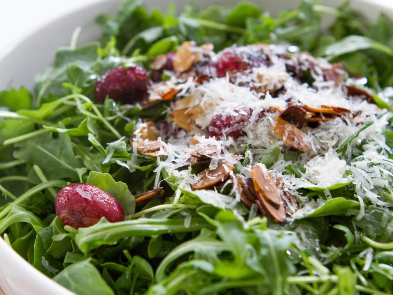 - Добавьте рукколу в большую миску. Добавьте сверху виноград. Полейте салат заправкой. Посыпьте миндалем, натрите сверху немного свежего пармезана и сразу подавайте.