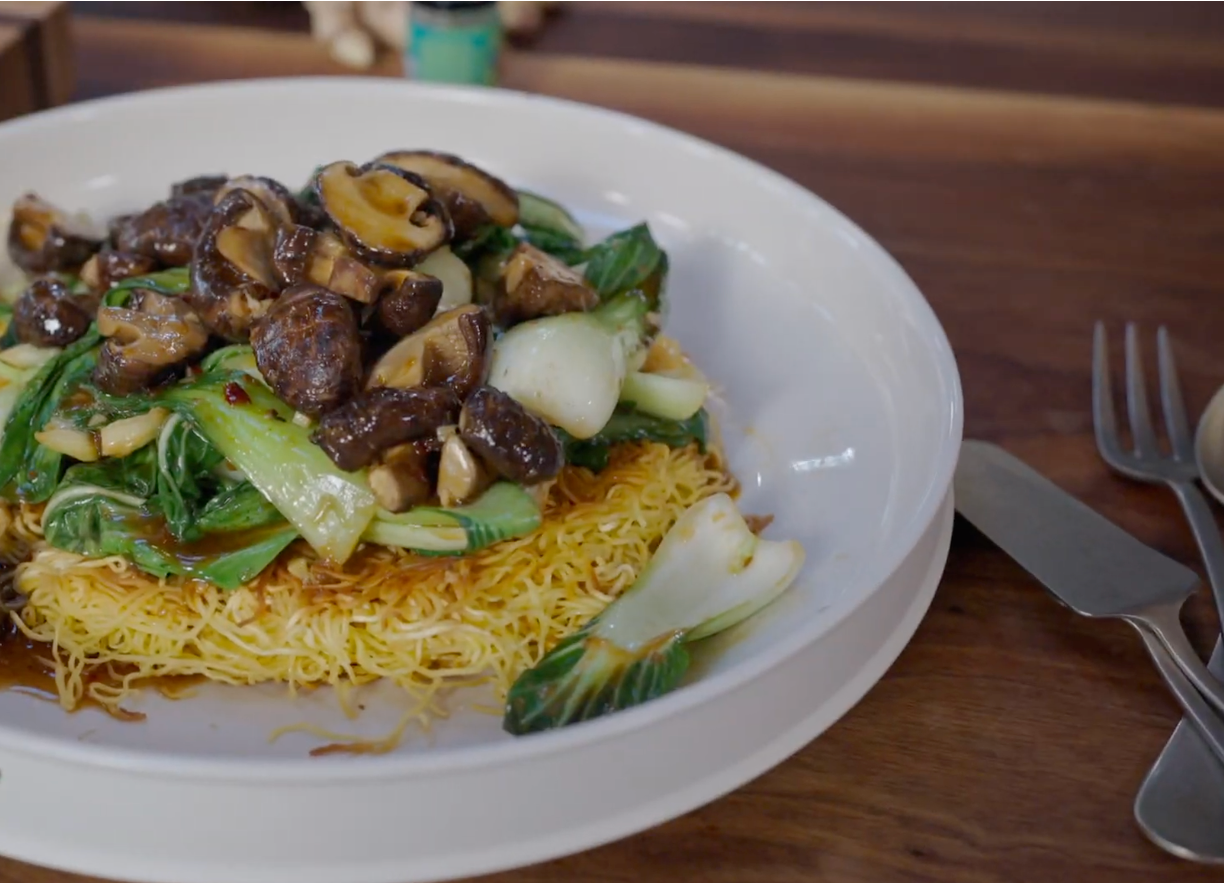 Рецепт тушеных грибов шиитаке с молодой бок-чой и хрустящей лапшой