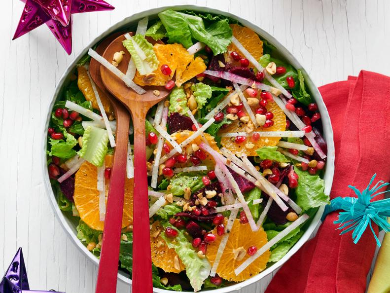 - Положите нарезанный ромэн в большую миску или разложите на блюде. Добавьте свеклу, хикаму и апельсины.