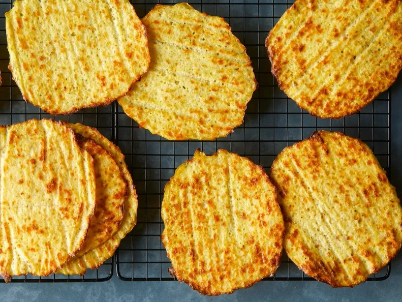 - Выстелите 2 больших противня пергаментной бумагой и смажьте ее маслом. Выложите ровным слоем 1/4 стакана смеси цветной капусты и равномерно распределите 6 горок на каждом противне. Пальцами прижмите и распределите смесь в аккуратные кружочки шириной около 5 дюймов (как обычные лепешки), убедившись, что нет никаких отверстий. Выпекайте, поворачивая противни на полпути, пока лепешки не станут твердыми и не подрумянятся снизу, около 20 минут. Полностью остудите на противнях. Заверните и поставьте в холодильник на срок до 5 дней или заморозьте на срок до 1 месяца.