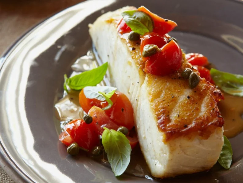 - Посыпьте палтуса с обеих сторон 1 чайной ложкой соли и перца. Разогрейте масло в большой сковороде с жаропрочной ручкой на среднем огне, пока оно не начнет мерцать, но не будет дымиться. Положите филе кожей вверх в горячее масло и обжаривайте, пока рыба не начнет менять цвет, 2–3 минуты. Переверните филе и добавьте в сковороду лимонный сок, вино и масло. Как только масло растает и начнет пениться, добавьте каперсы и помидоры и тушите, пока помидоры не выделят немного сока, около 1 минуты.