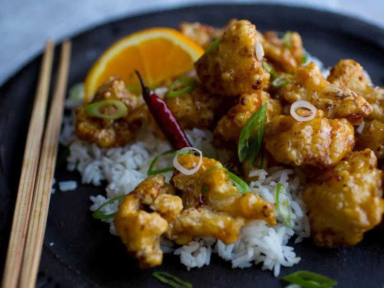 - Обжарьте цветную капусту тремя партиями; аккуратно поместите цветную капусту в горячее масло и готовьте, разделяя кусочки и регулируя огонь по мере необходимости, чтобы поддерживать температуру масла 350 градусов по Фаренгейту, до светло-коричневого цвета и хрустящей корочки, около 6 минут. Выньте цветную капусту с помощью лопатки или шумовки и положите на подготовленную решетку, чтобы дать стечь лишнему жиру. Переложите цветную капусту в большую миску, пока она еще горячая, и перемешайте с соусом, чтобы равномерно покрыть ее. Переложите на сервировочную тарелку и посыпьте зеленым луком. Подавайте с рисом и дольками апельсина.