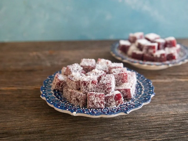 - Когда будете готовы подавать, щедро посыпьте рабочую поверхность кокосовой стружкой. Переверните квадратик рахат-лукума на покрытую поверхность и посыпьте сверху еще кокосом. Нарежьте на кубики размером 1/2 дюйма острым ножом. Добавьте еще кокоса и разложите на тарелке.