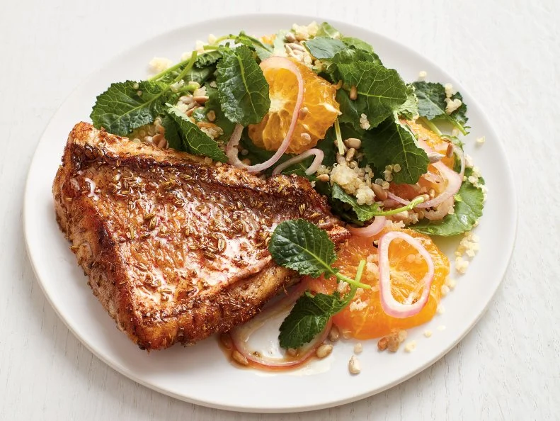- Тем временем промокните рыбную кожу бумажными полотенцами. Приправьте рыбу семенами фенхеля, солью и перцем. Сбрызните 1 столовой ложкой оливкового масла большую антипригарную сковороду. Положите рыбу кожей вниз, поставьте сковороду на средний огонь и готовьте рыбу, не перемещая, пока она почти не прожарится, а кожа не станет золотистой.