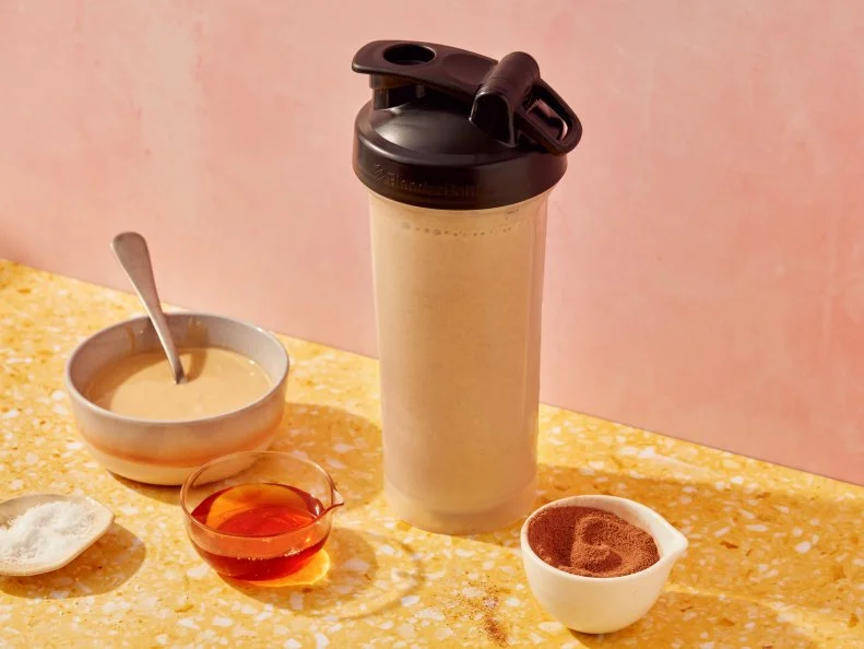шейкер с насадкой-блендером- Поместите молоко, лабне, протеиновый порошок, подсластитель, тахини и соль в шейкер с насадкой-блендером и взбивайте до получения однородной массы (около 1 минуты).