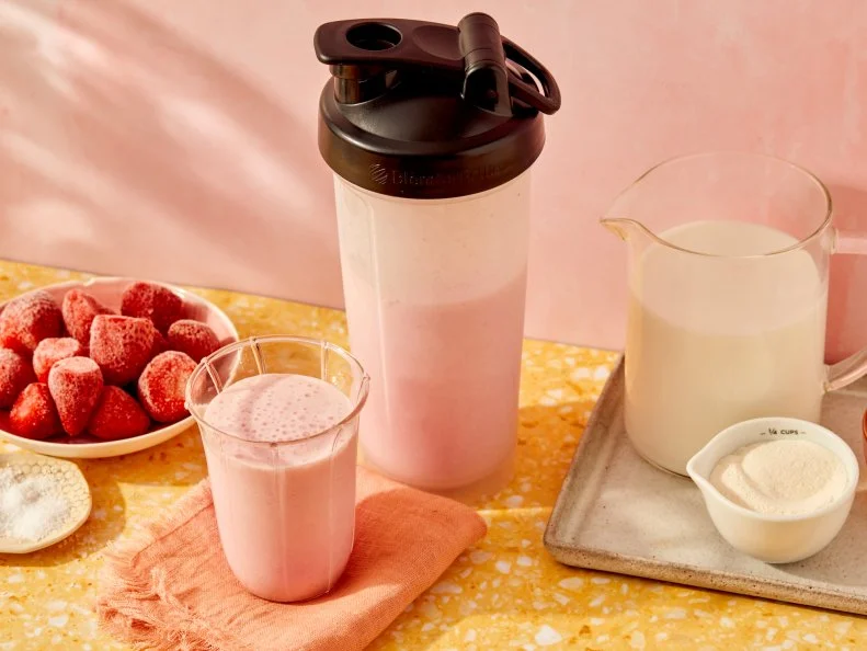 персональный или мощный блендер- Добавьте молоко, клубнику, протеиновый порошок, сливочный сыр, подсластитель и соль в блендер высокой или низкой мощности и взбивайте на средней скорости до получения однородной массы (около 1 минуты).
