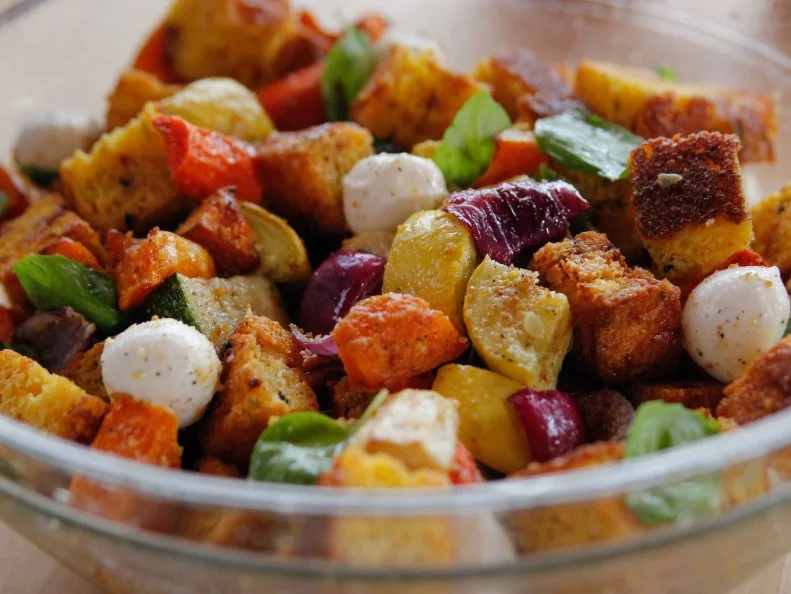 Быстрое запекание в духовке оставляет такие красочные овощи, как красный лук, кабачки и морковь, сладкими и нежными. Смешайте их с кукурузным хлебом Ree's, кремовыми шариками моцареллы и пикантным винегретом, чтобы создать салат, достойный восхищения.