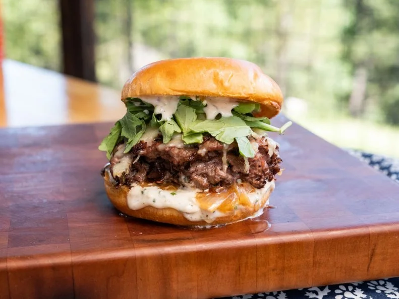 - Смажьте нижнюю булочку майонезом айоли и положите сверху полную ложку карамелизированного лука, немного рубленого зеленого лука, котлету, немного отложенных бычьих хвостов и ложку подливки из бычьих хвостов. Закончите горстью заправленной рукколы и добавьте верхнюю булочку. Повторите с оставшимися ингредиентами, чтобы сделать еще 5.