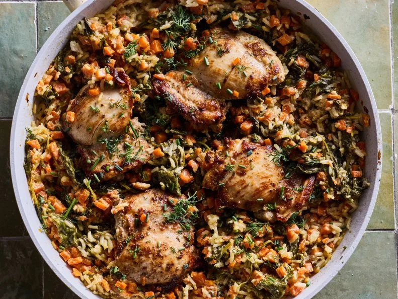 - Взбейте вместе куриный бульон, сметану и оставшуюся приправу ранч в небольшой миске. Перемешайте шпинат и рис в сковороде и готовьте, пока шпинат не завянет, около 1 минуты. Влейте бульонную смесь, затем убедитесь, что рис и шпинат полностью погружены в жидкость. Добавьте куриные бедра обратно в сковороду плоской стороной вверх. Влейте также все накопившиеся куриные соки. Доведите жидкость до кипения; накройте крышкой, убавьте огонь до слабого и готовьте, пока рис не станет мягким, а курица не будет готова, около 15 минут. Выключите огонь и оставьте под крышкой на 5 минут. Снимите крышку. Сверху посыпьте зеленым луком и укропом.