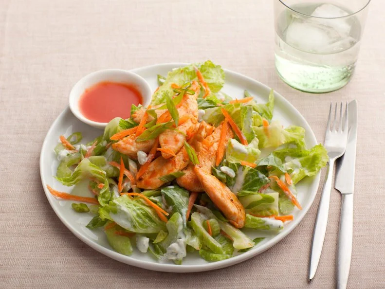 - В большой миске смешайте ромэн, сельдерей, тертую морковь и зеленый лук. Перемешайте с заправкой. Разложите зелень по 4 тарелкам, сверху положите курицу. Подавайте с очень острым соусом.