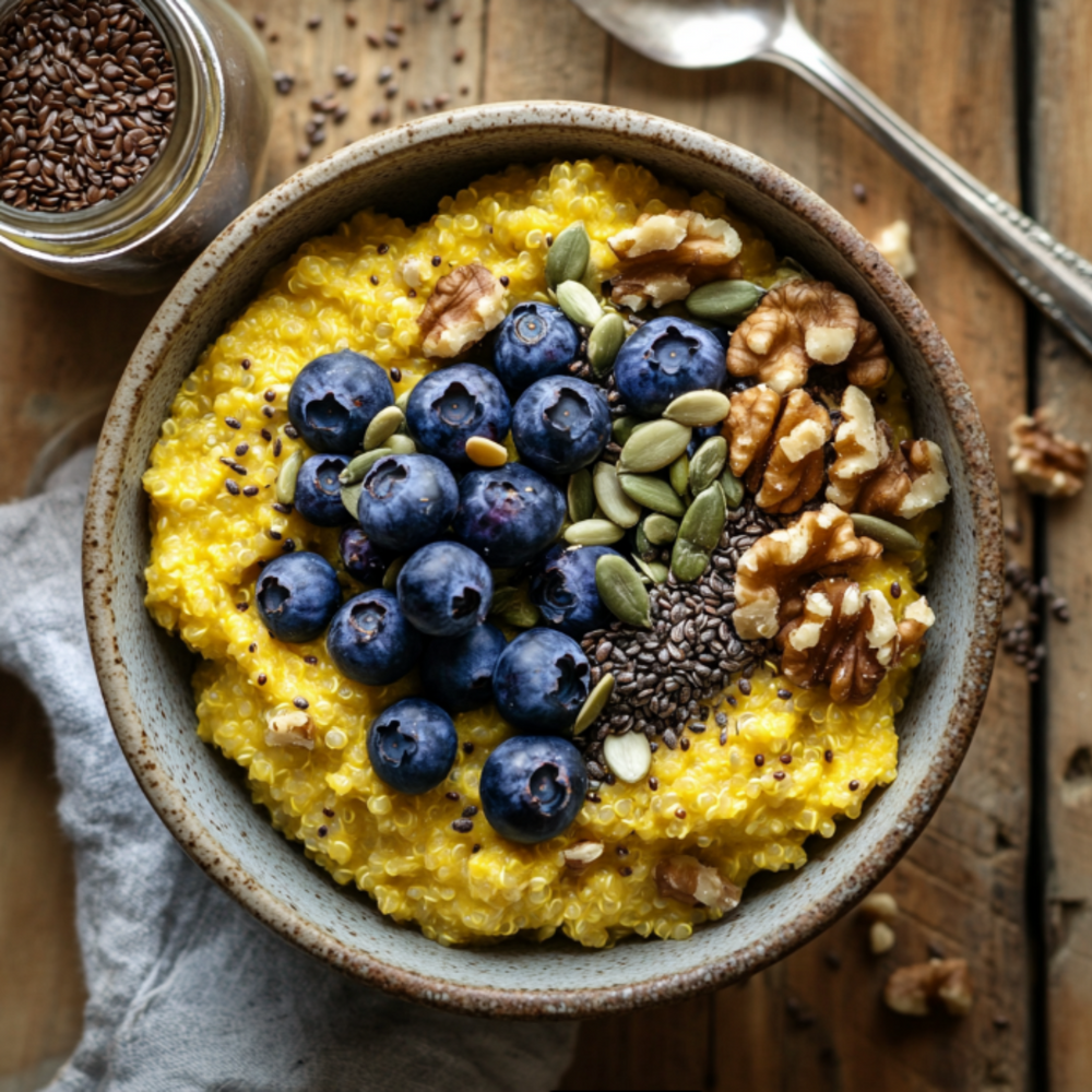 Подзарядите свой разум и тело этим богатым питательными веществами завтраком, разработанным для поддержания когнитивных функций и поддержания энергии. Сочетание богатой белком киноа с такими полезными для мозга ингредиентами, как грецкие орехи с омега-3, богатая антиоксидантами черника и противовоспалительная куркума, делает это блюдо источником энергии для ясности ума. Добавление семян чиа, льна и тыквенных семечек обеспечивает организм незаменимыми жирными кислотами и минералами, которые поддерживают здоровье мозга.